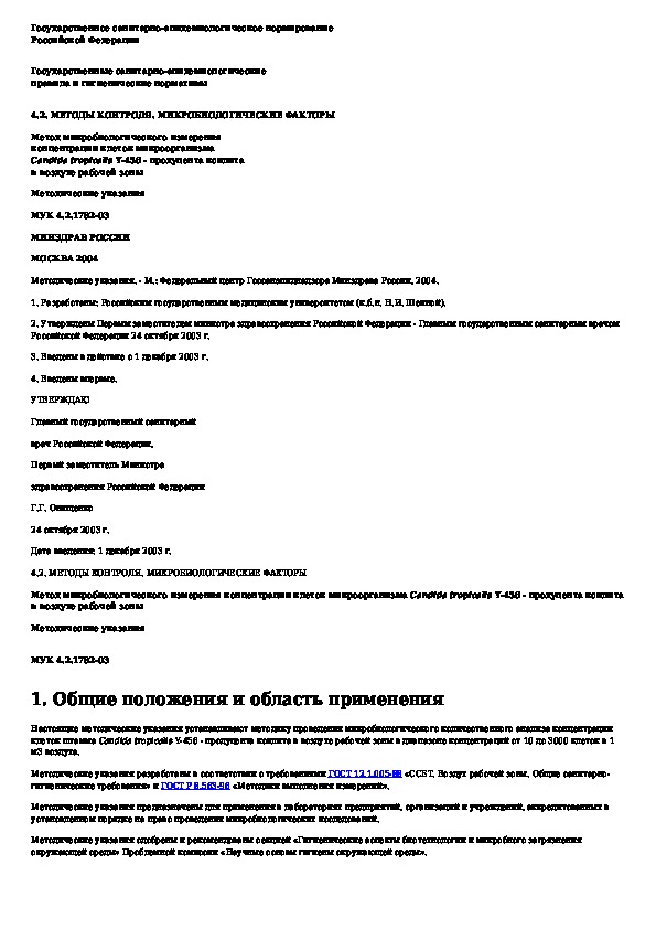 МУК 4.2.1782-03: Метод микробиологического измерения концентрации клеток микроорганизма Candida tropicalis Y-456 - продуцента ксилита в воздухе рабочей зоны