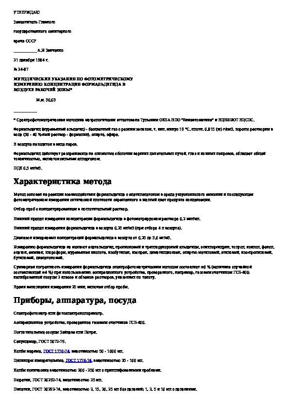 Методические указания по фотометрическому измерению концентраций формальдегида в воздухе рабочей зоны
