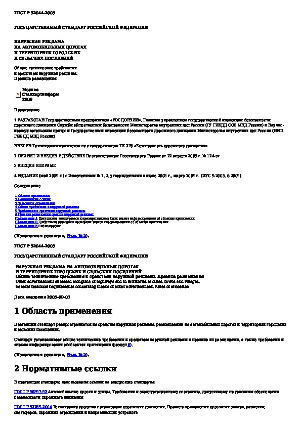 ГОСТ Р 52044-2003: Наружная реклама на автомобильных дорогах и территориях городских и сельских поселений. Общие технические требования к средствам