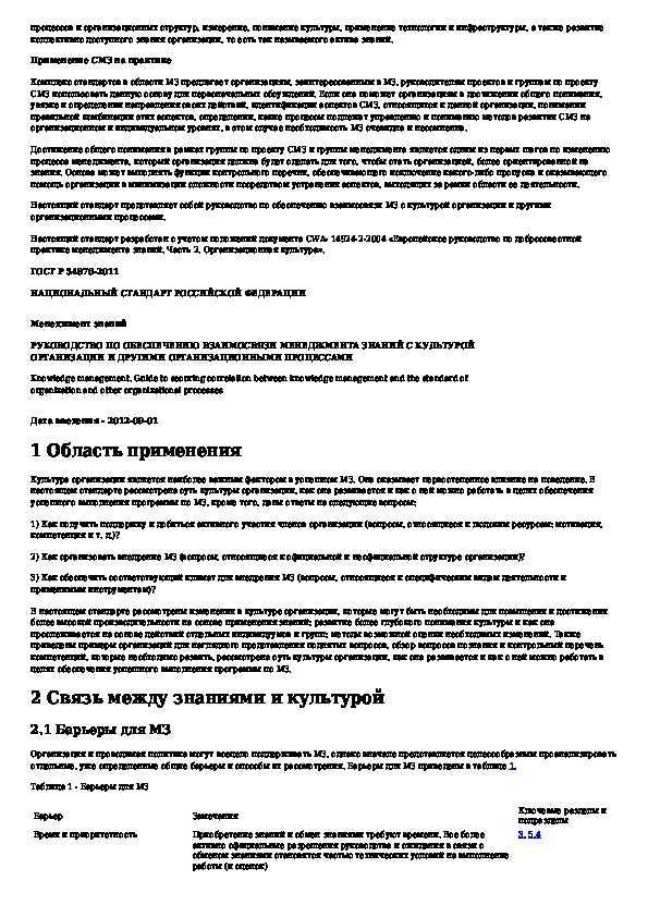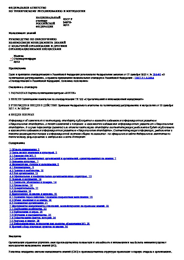 ГОСТ Р 54876-2011: Менеджмент знаний. Руководство по обеспечению взаимосвязи менеджмента знаний с культурой организации и другими организационными