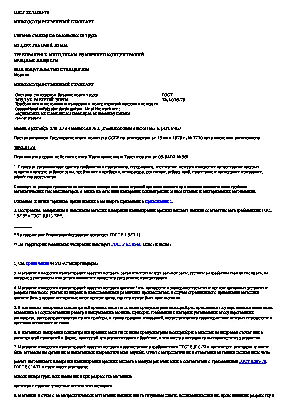 ГОСТ 12.1.016-79: Система стандартов безопасности труда. Воздух рабочей зоны. Требования к методикам измерения концентраций вредных веществ