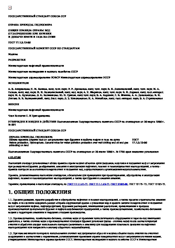 ГОСТ 17.1.3.12-86: Охрана природы. Гидросфера. Общие правила охраны вод от загрязнения при бурении и добыче нефти и газа на суше