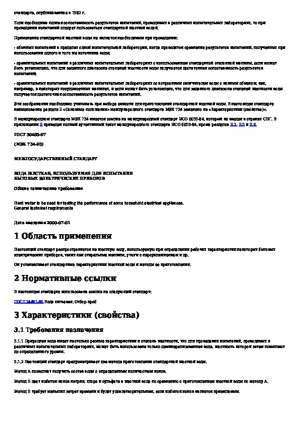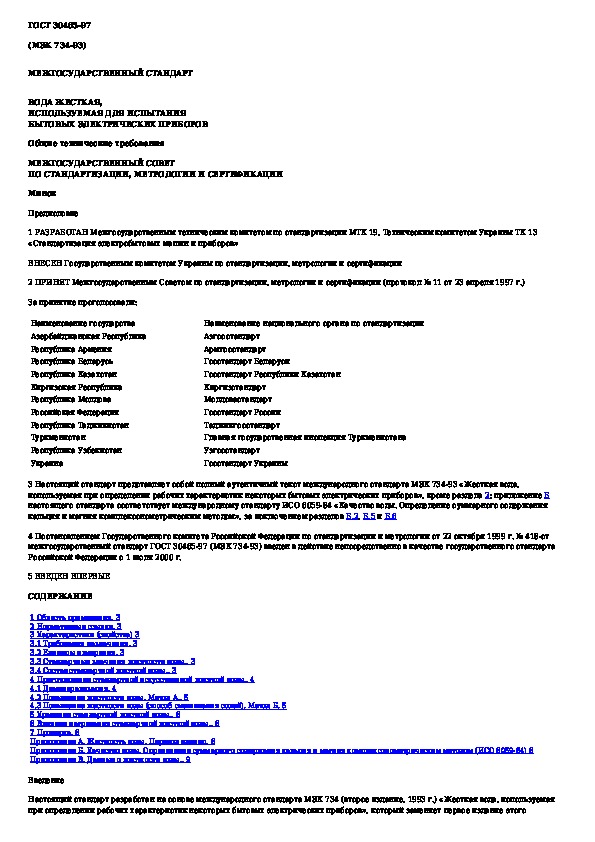 ГОСТ 30465-97: Вода жесткая, используемая для испытания бытовых электрических приборов. Общие технические требования