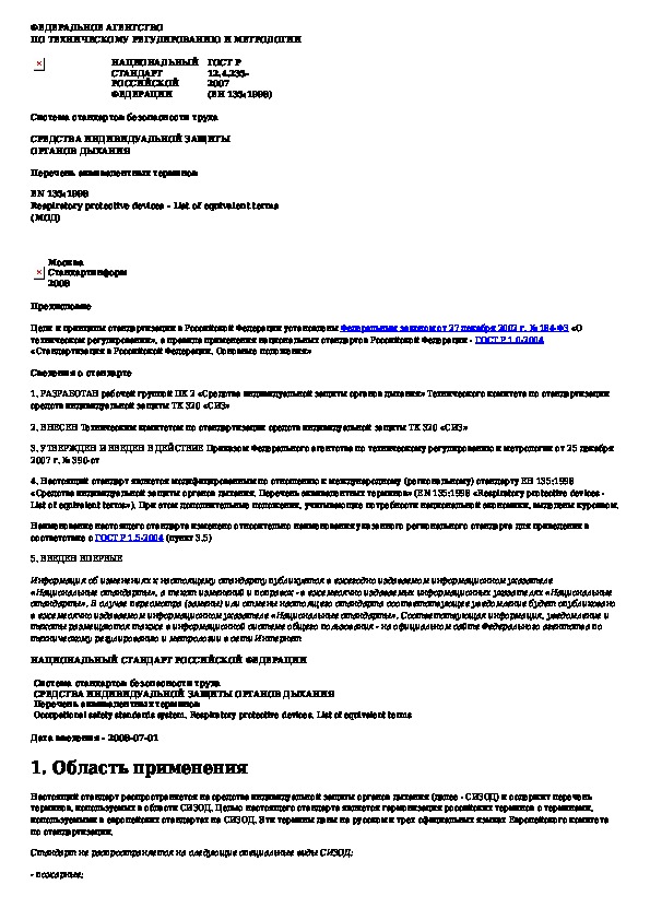 ГОСТ Р 12.4.235-2007: Система стандартов безопасности труда. Средства индивидуальной защиты органов дыхания. Перечень эквивалентных терминов
