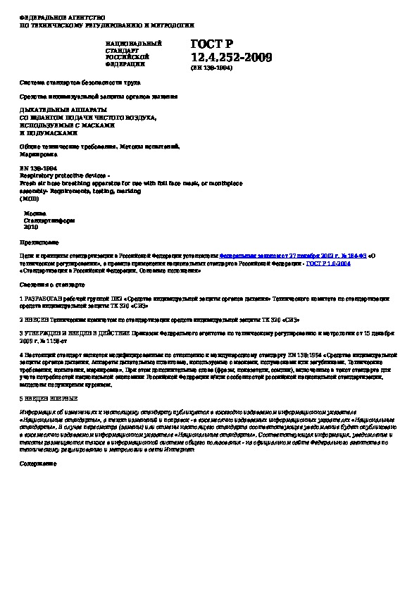 ГОСТ Р 12.4.252-2009: Система стандартов безопасности труда. Средства индивидуальной защиты органов дыхания. Дыхательные аппараты со шлангом подачи чи