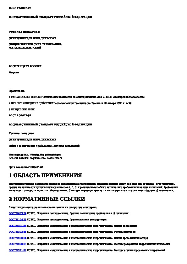 ГОСТ Р 51017-97: Техника пожарная. Огнетушители передвижные. Общие технические требования. Методы испытаний