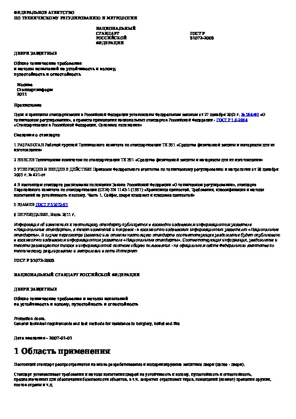 ГОСТ Р 51072-2005: Двери защитные. Общие технические требования и методы испытаний на устойчивость к взлому, пулестойкость и огнестойкость