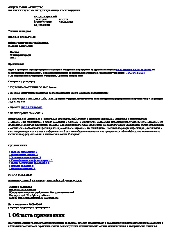 ГОСТ Р 51844-2009: Техника пожарная. Шкафы пожарные. Общие технические требования. Методы испытаний
