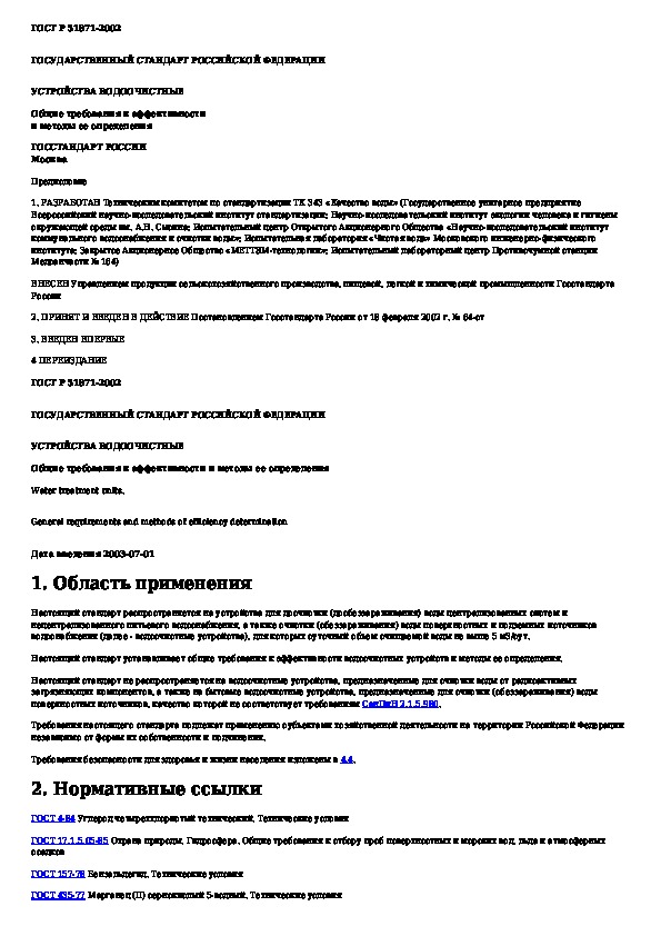 ГОСТ Р 51871-2002: Устройства водоочистные. Общие требования к эффективности и методы ее определения