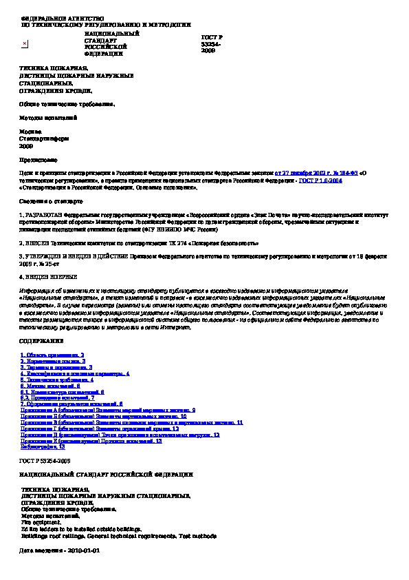 ГОСТ Р 53254-2009: Техника пожарная. Лестницы пожарные наружные стационарные. Ограждения кровли. Общие технические требования. Методы испытаний