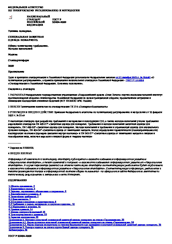 ГОСТ Р 53264-2009: Техника пожарная. Специальная защитная одежда пожарного. Общие технические требования. Методы испытаний