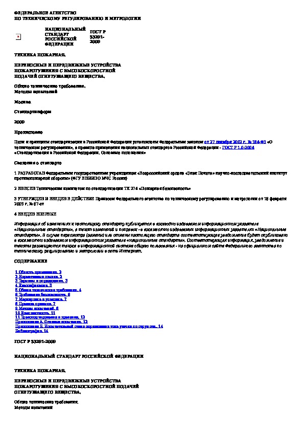 ГОСТ Р 53291-2009: Техника пожарная. Переносные и передвижные устройства пожаротушения с высокоскоростной подачей огнетушащего вещества. Общие тех