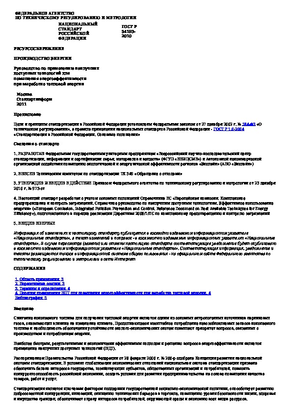 ГОСТ Р 54193-2010: Ресурсосбережение. Производство энергии. Руководство по применению наилучших доступных технологий для повышения энергоэффектив