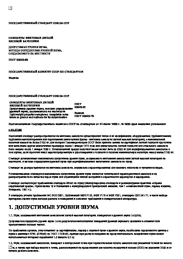 ГОСТ 23023-85: Самолеты винтовые легкой весовой категории. Допустимые уровни шума, методы определения уровней шума, создаваемого на местности