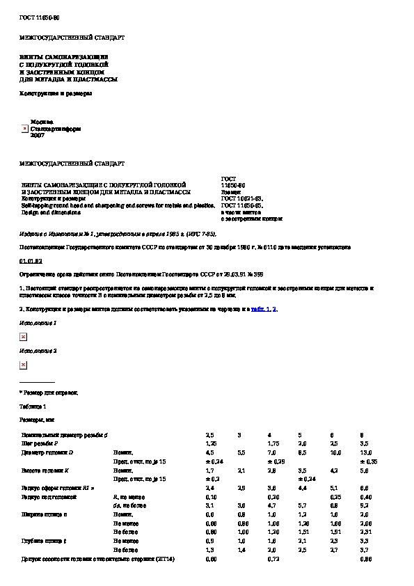 ГОСТ 11650-80: Винты самонарезающие с полукруглой головкой и заостренным концом для металла и пластмассы. Конструкция и размеры