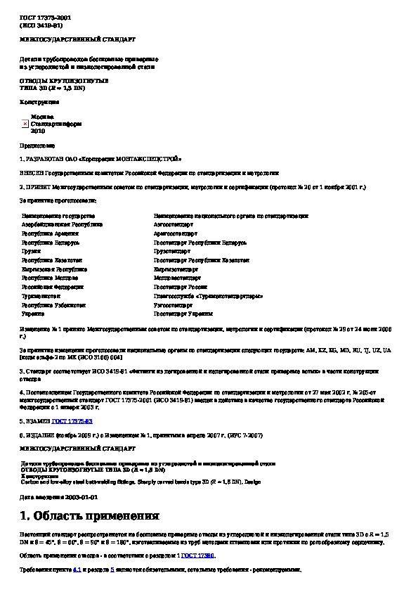 Наша цель состоит в том, чтобы предоставить вам быстрый доступ к содержанию документа Детали трубопроводов бесшовные приварные из углеродистой и низколегированной стали. Отводы крутоизогнутые типа 3D (R около 1,5 DN). Ко.