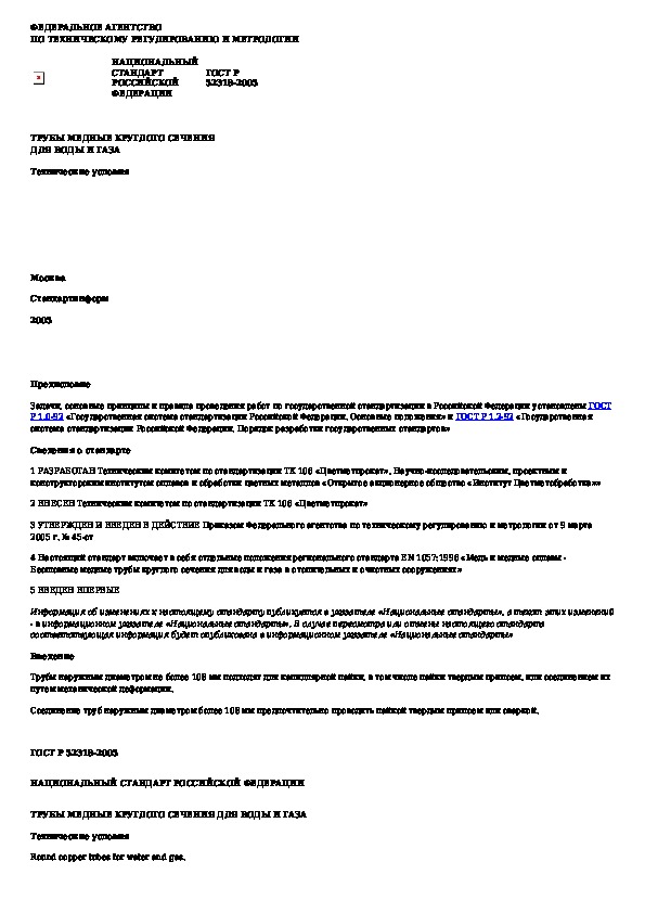 ГОСТ Р 52318-2005: Трубы медные круглого сечения для воды и газа. Технические условия