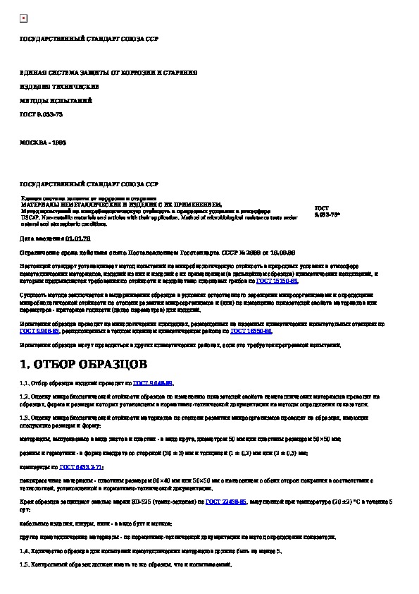 ГОСТ 9.053-75: Единая система защиты от коррозии и старения. Материалы неметаллические и изделия с их применением. Метод испытаний на микробиоло