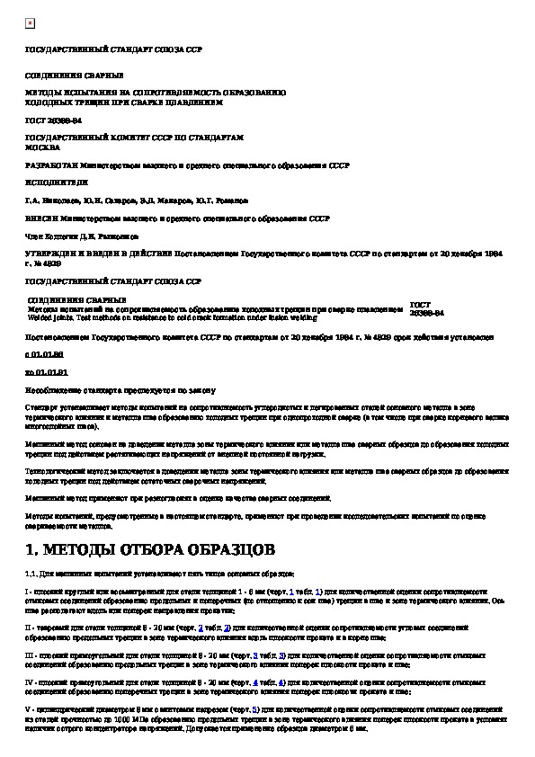 ГОСТ 26388-84: Соединения сварные. Методы испытаний на сопротивляемость образованию холодных трещин при сварке плавлением
