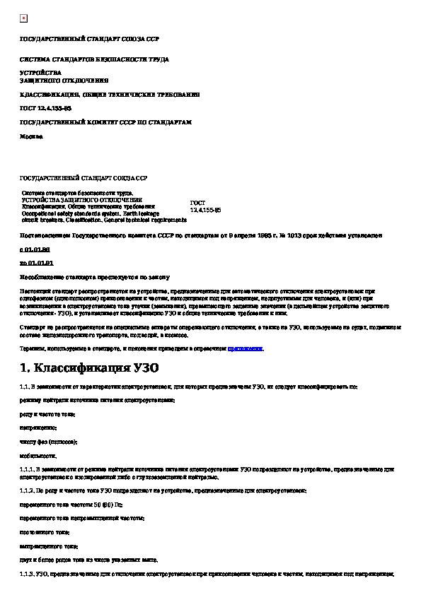 ГОСТ 12.4.155-85: Система стандартов безопасности труда. Устройства защитного отключения. Классификация. Общие технические требования