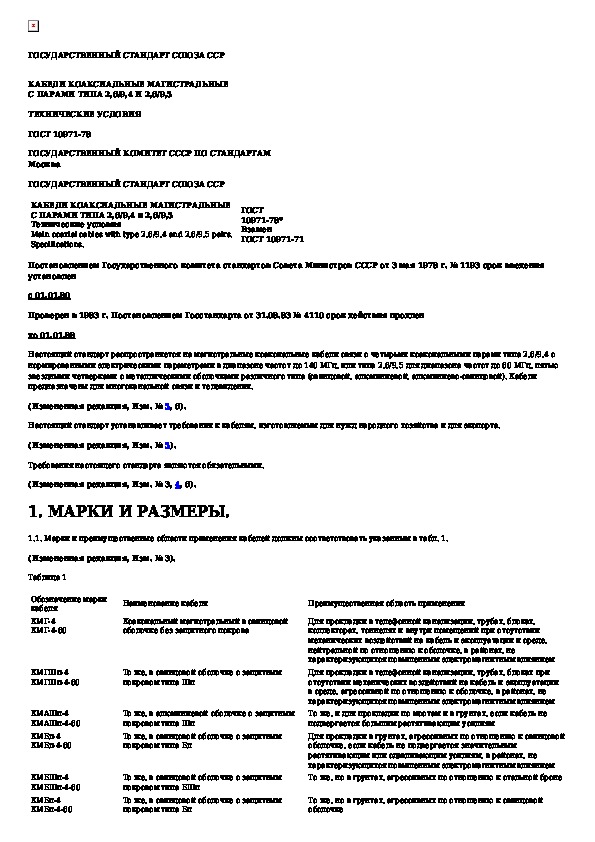 ГОСТ 10971-78: Кабели коаксиальные магистральные с парами типа 2,6/9,4 и 2,6/9,5. Технические условия