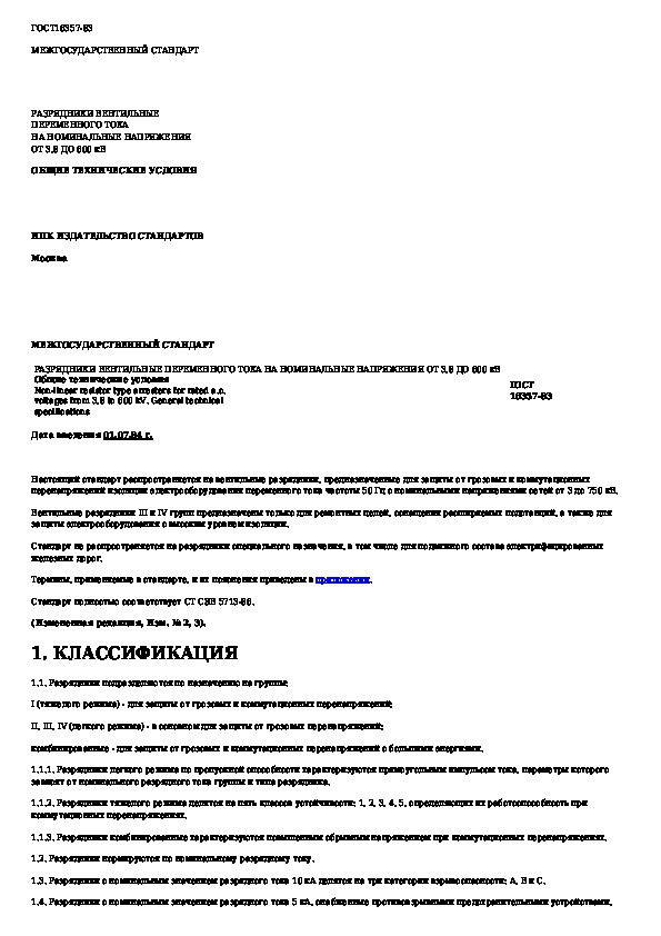 ГОСТ 16357-83: Разрядники вентильные переменного тока на номинальные напряжения от 3,8 до 600 кВ. Общие технические условия