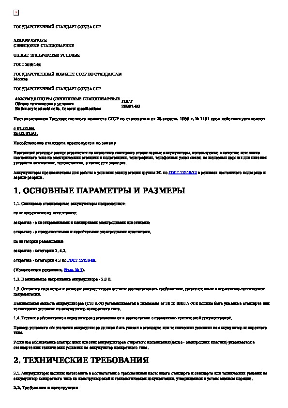 ГОСТ 26881-86: Аккумуляторы свинцовые стационарные. Общие технические условия