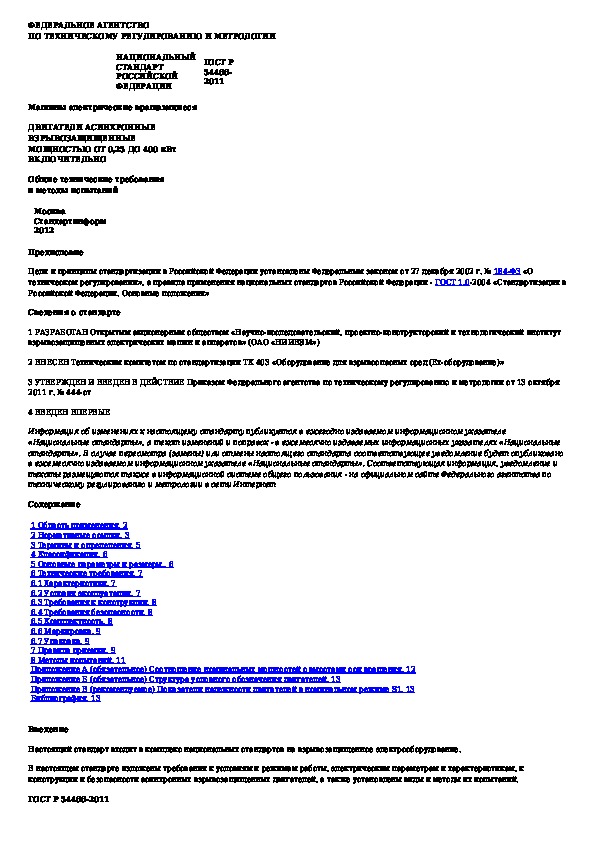 ГОСТ Р 54466-2011: Машины электрические вращающиеся. Двигатели асинхронные взрывозащищенные мощностью от 0,25 до 400 кВт включительно. Общие техническ
