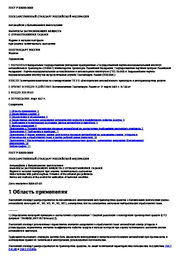 ГОСТ Р 52033-2003: Автомобили с бензиновыми двигателями. Выбросы загрязняющих веществ с отработавшими газами. Нормы и методы контроля при оценке тех
