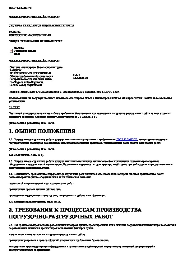 ГОСТ 12.3.009-76: Система стандартов безопасности труда. Работы погрузочно-разгрузочные. Общие требования безопасности