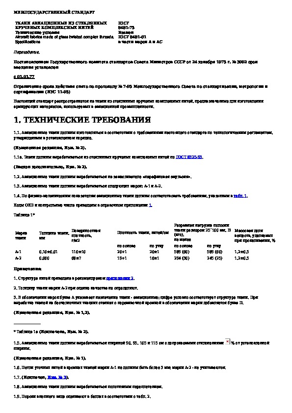 ГОСТ 8481-75: Ткани авиационные из стеклянных крученых комплексных нитей. Технические условия