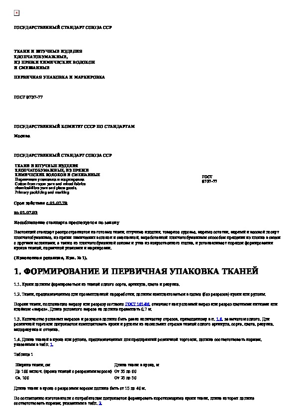 ГОСТ 8737-77: Ткани и штучные изделия хлопчатобумажные, из пряжи химических волокон и смешанные. Первичная упаковка и маркировка