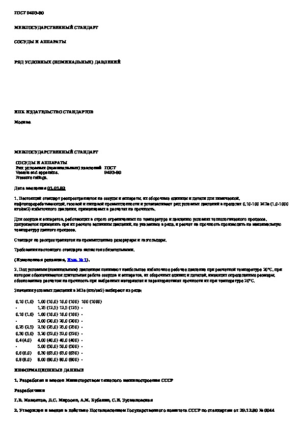 ГОСТ 9493-80: Сосуды и аппараты. Ряд условных (номинальных) давлений