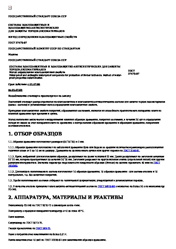 Наша цель состоит в том, чтобы предоставить вам быстрый доступ к содержанию документа Составы влагозащитные и влагозащитно-антисептические для защиты торцов лесоматериалов. Метод определения влагозащитных свойств.