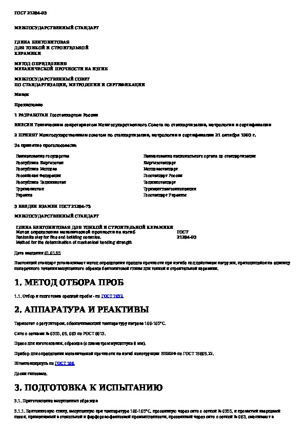 ГОСТ 21284-93: Глина бентонитовая для тонкой и строительной керамики. Метод определения механической прочности на изгиб