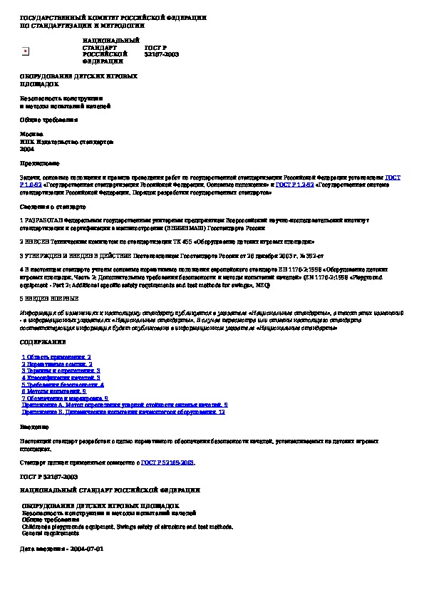 Наша цель состоит в том, чтобы предоставить вам быстрый доступ к содержанию документа Оборудование детских игровых площадок. Безопасность конструкции и методы испытаний качелей. Общие требования.