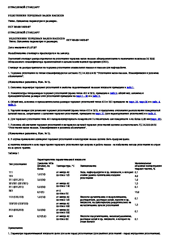 ОСТ 26-06-1493-87: Уплотнения торцевые валов насосов. Типы. Основные параметры и размеры