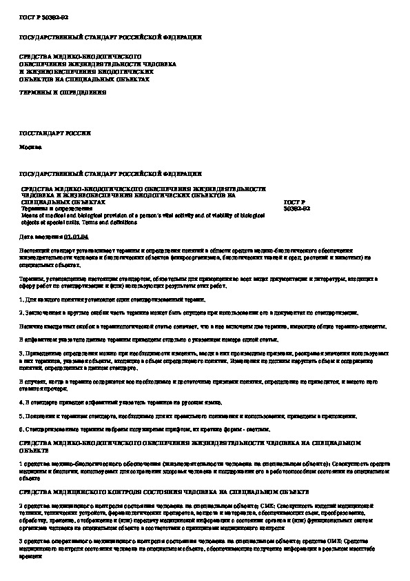 ГОСТ Р 50382-92: Средства медико-биологического обеспечения жизнедеятельности человека и жизнеобеспечения биологических объектов на специальны