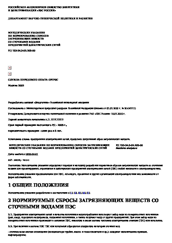РД 153-34.3-02.205-00: Методические указания по нормированию сбросов загрязняющих веществ со сточными водами предприятий электрических сетей