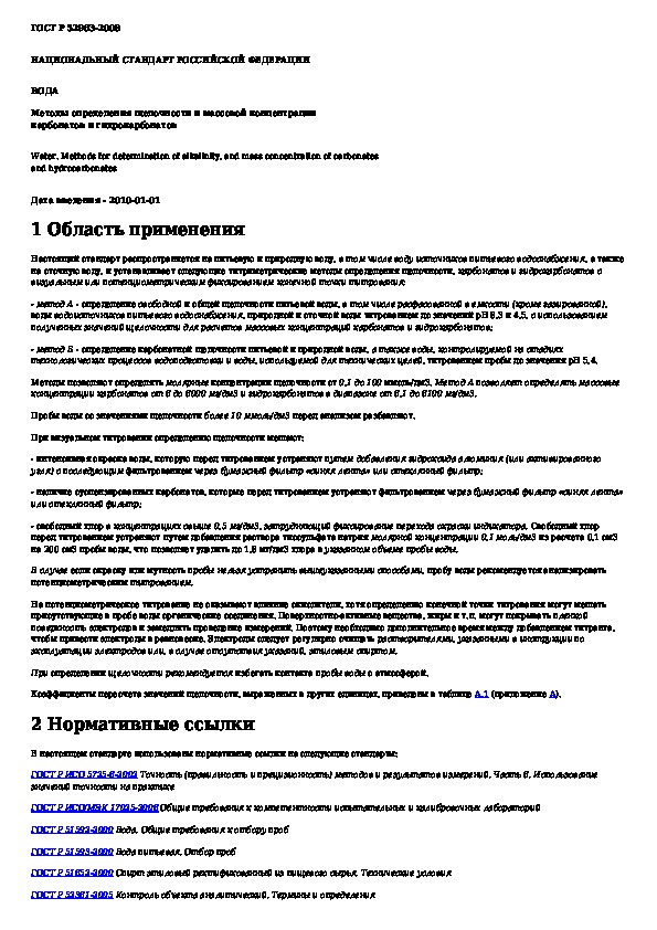 ГОСТ Р 52963-2008: Вода. Методы определения щелочности и массовой концентрации карбонатов и гидрокарбонатов