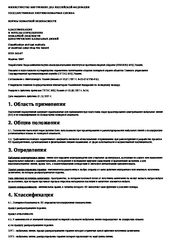 НПБ 242-97: Классификация и методы определения пожарной опасности электрических кабельных линий