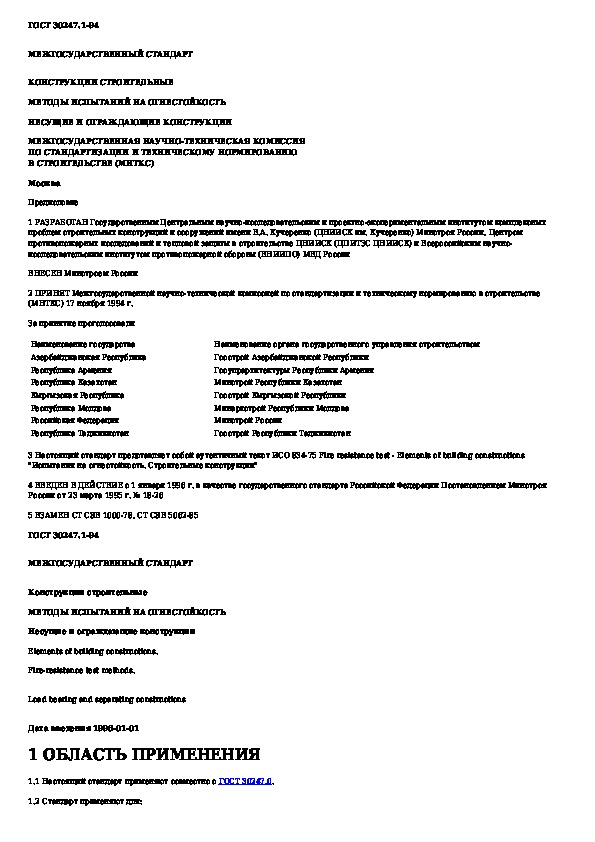 ГОСТ 30247.1-94: Конструкции строительные. Методы испытаний на огнестойкость. Несущие и ограждающие конструкции