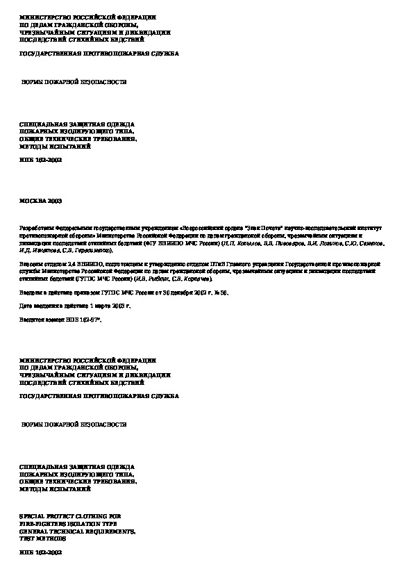 НПБ 162-2002: Специальная защитная одежда пожарных изолирующего типа. Общие технические требования. Методы испытаний