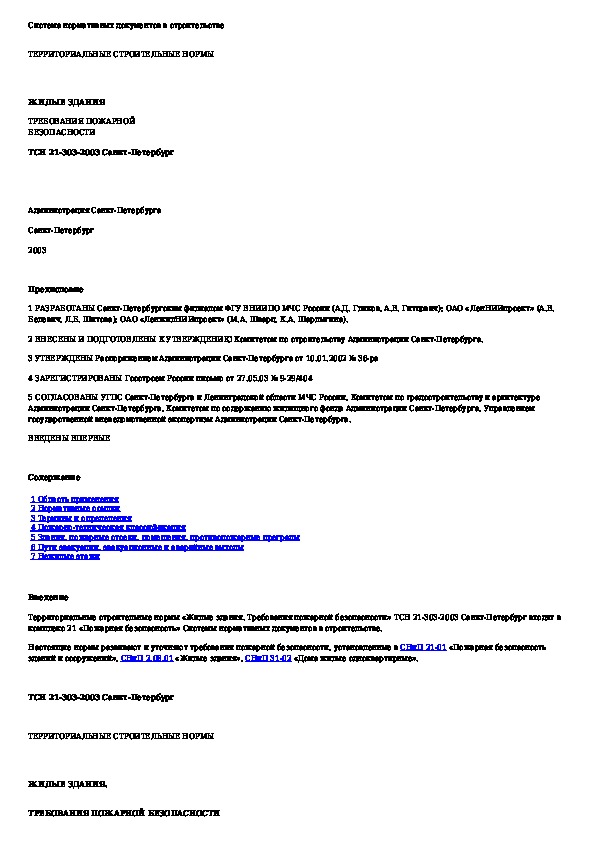 ТСН 21-303-2003: Жилые здания. Требования пожарной безопасности. г. Санкт-Петербург