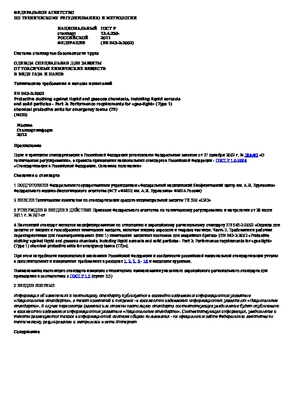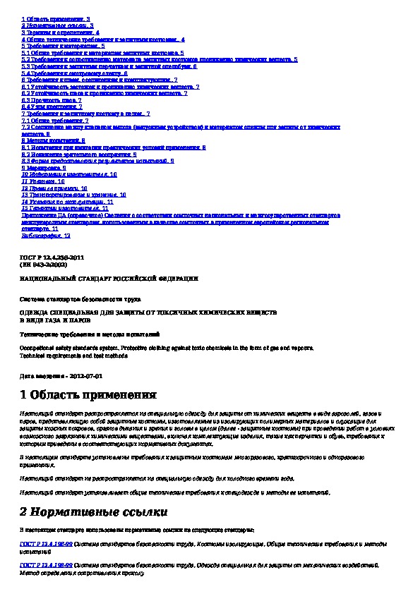 ГОСТ Р 12.4.256-2011: Система стандартов безопасности труда. Одежда специальная для защиты от токсичных химических веществ в виде газа и паров. Техниче