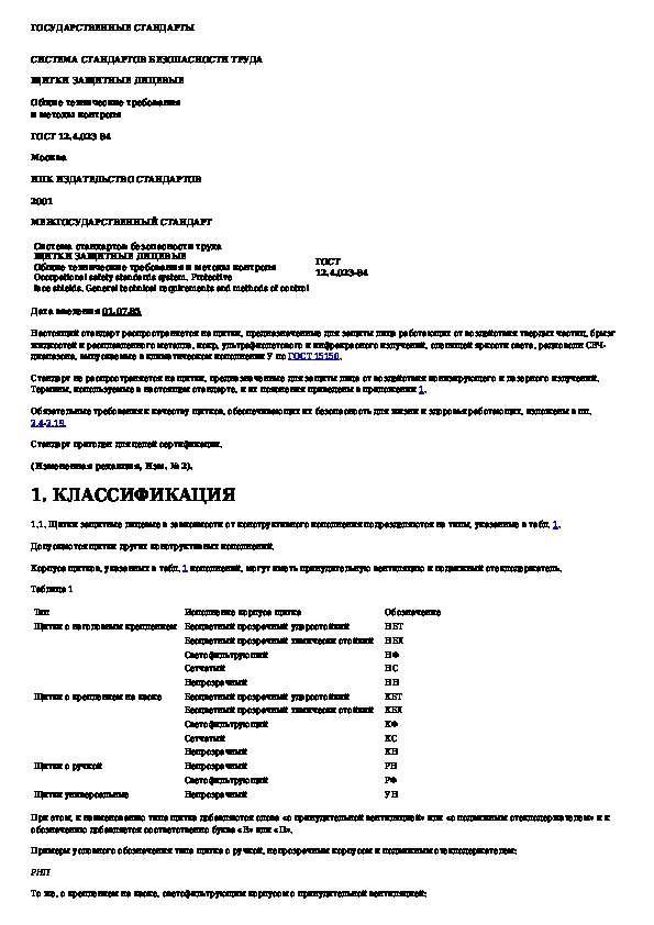 ГОСТ 12.4.023-84: Система стандартов безопасности труда. Щитки защитные лицевые. Общие технические требования и методы контроля