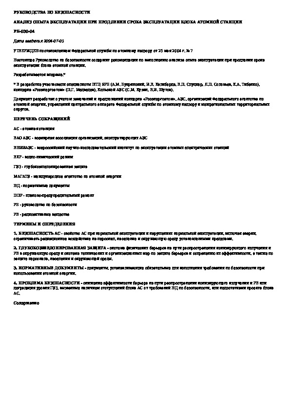РБ 030-04: Анализ опыта эксплуатации при продлении срока эксплуатации блока атомной станции