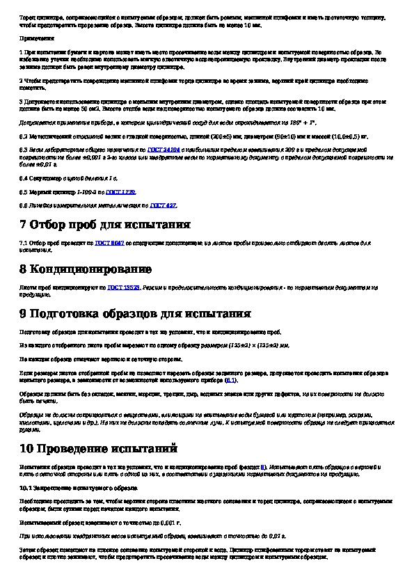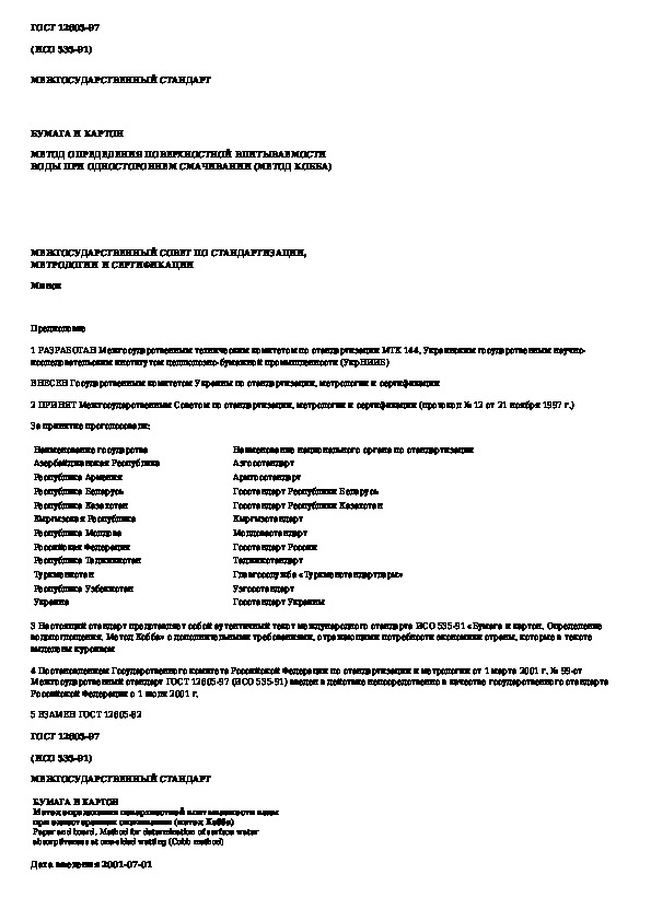 ГОСТ 12605-97: Бумага и картон. Метод определения поверхностной впитываемости воды при одностороннем смачивании (метод Кобба)