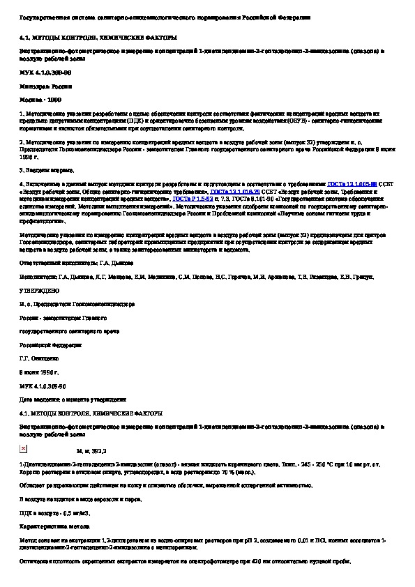 МУК 4.1.0.369-96: Экстракционно-фотометрическое измерение концентраций 1-диэтилендиамин-2-гептадеценил-2-имидазолина (олазола) в воздухе рабочей зо