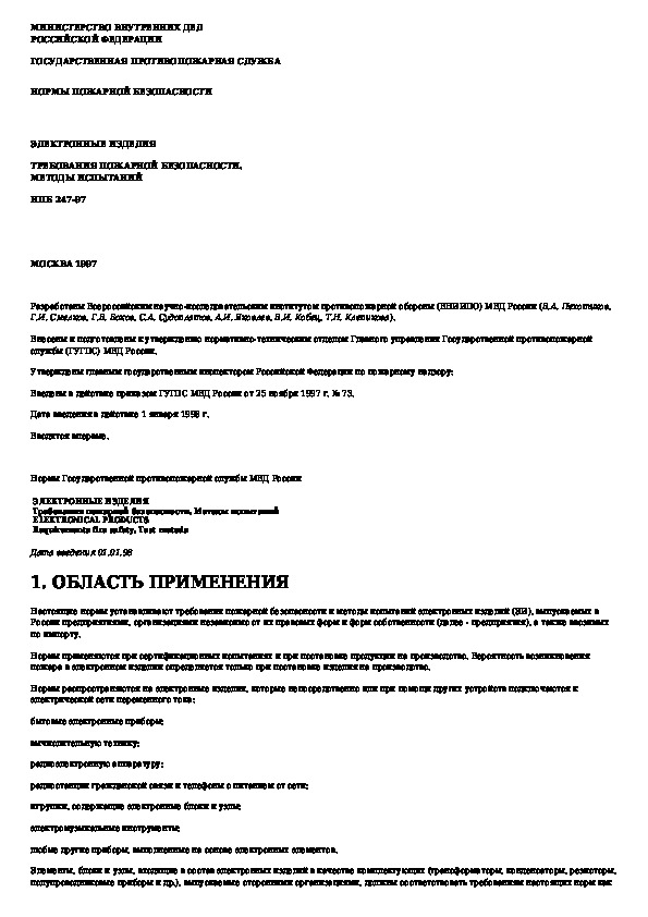 НПБ 247-97: Электронные изделия. Требования пожарной безопасности. Методы испытаний
